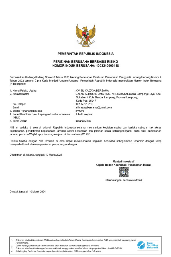 CV. Silica Zaya Bersama adalah badan usaha yang berbentuk CV, yang berdiri pada tahun 2024 sesuai SK Kemenkumham.